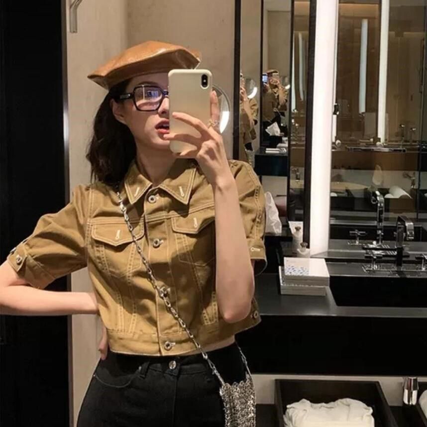 法式复古短款牛仔衬衫女秋夏ins新款高腰设计感小众短袖上衣外套热门设计联盟服务商